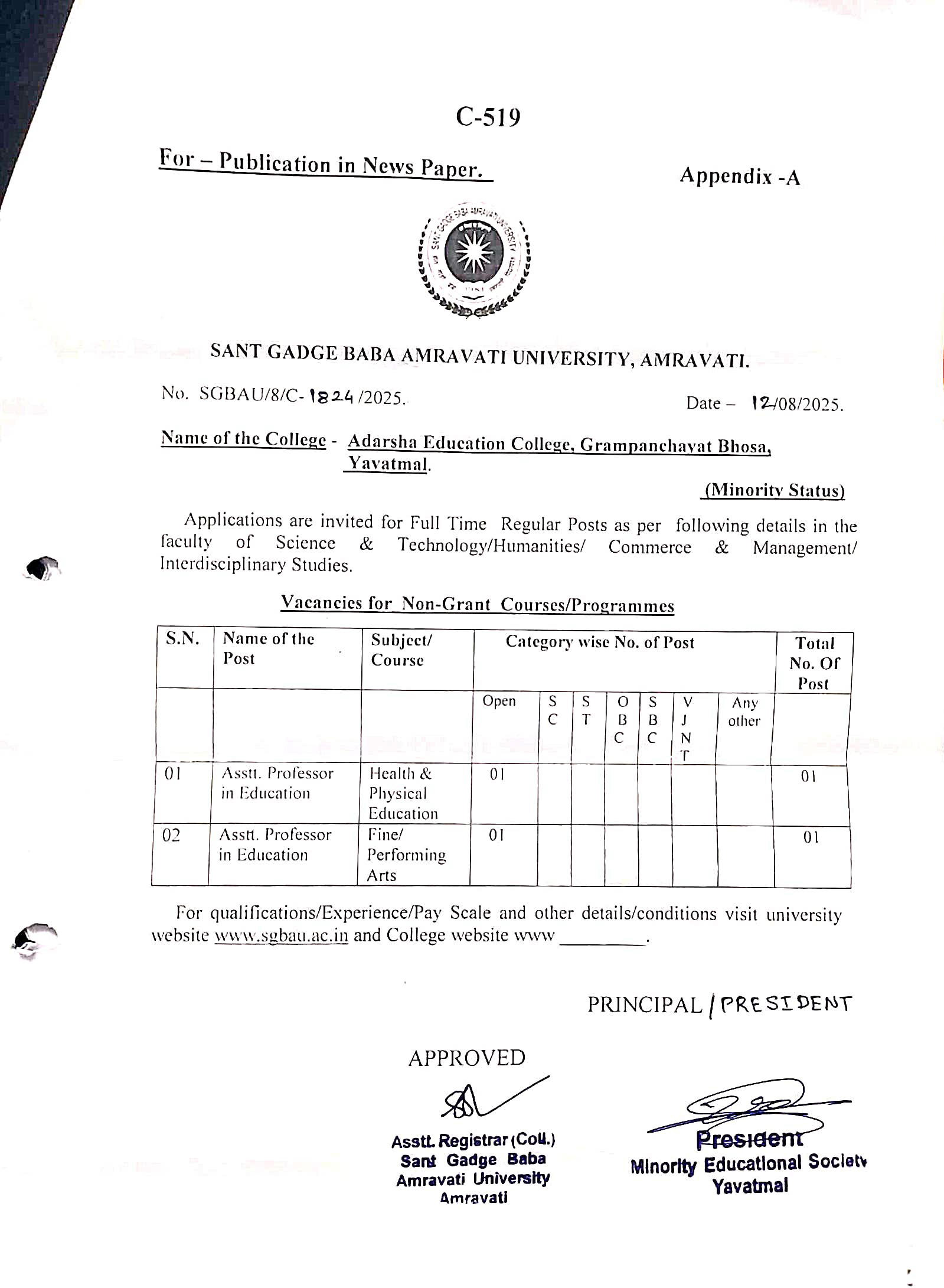 Vacancies for Non Grant Courses / Programmes B.Ed.